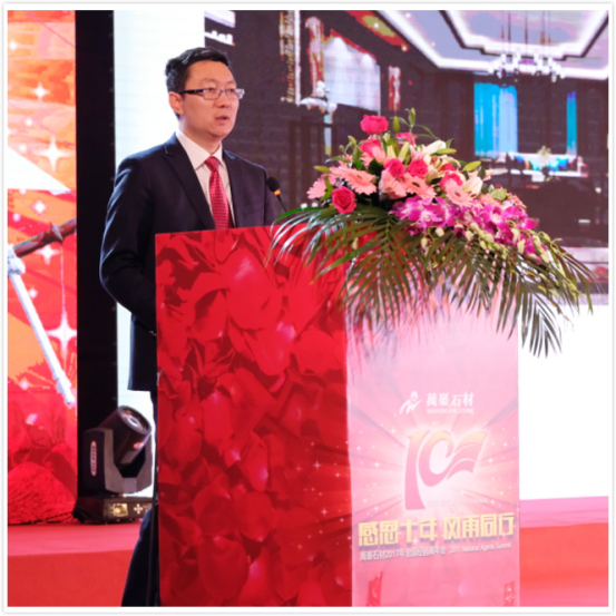 万峰石材股份营销总经理张洪斌先生做了“感恩十年,风雨同行”的主题报告,张总回顾了石材十年来的点点滴滴,提出企业要进行全渠道营销,并表示未来将大力发展装配式组合家居;渠道建设方面,石材将大力开发家装渠道,努力打造人造石消费者认知第一品牌!